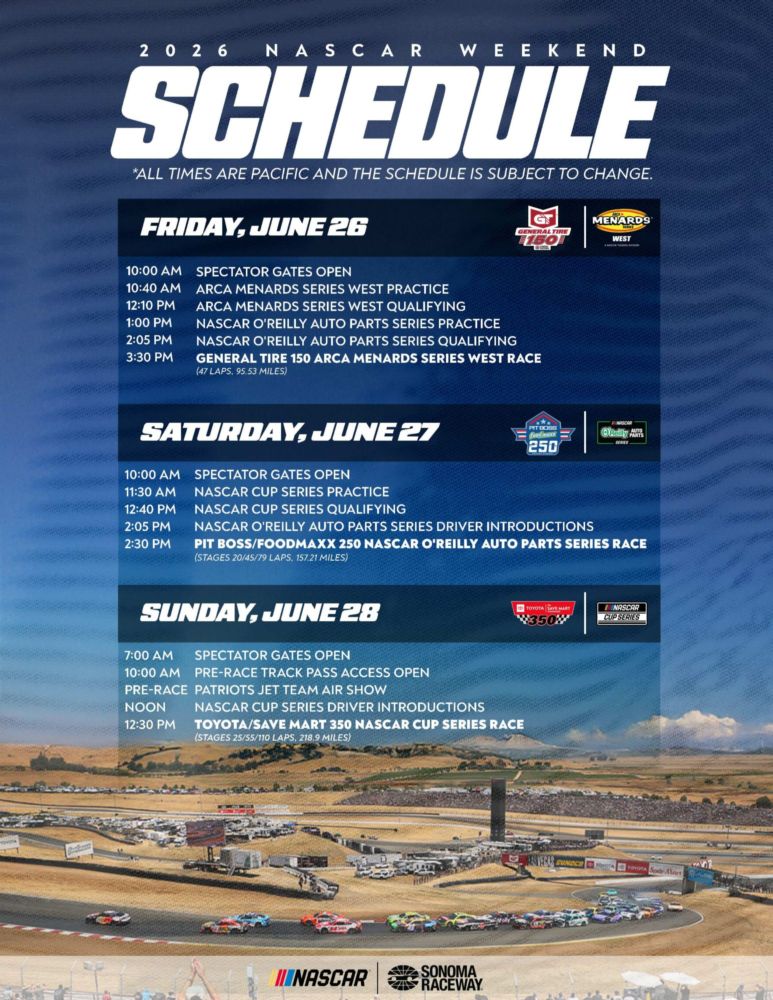 | 12:30 p.m. | Toyota/Save Mart 350 NASCAR Cup Series race (Stages 25/55/110 laps, 218.9 miles/352.2 kilometers) |