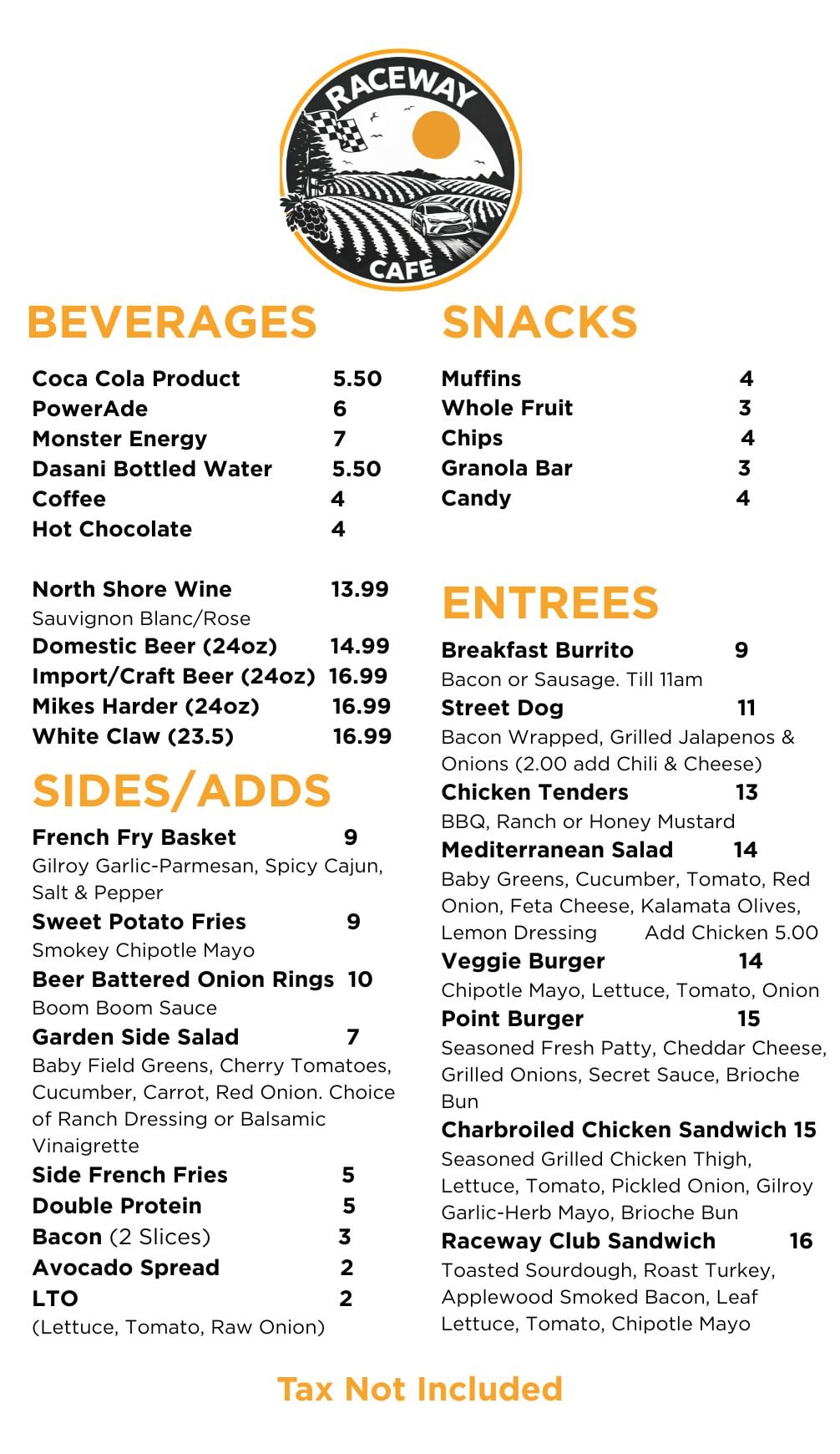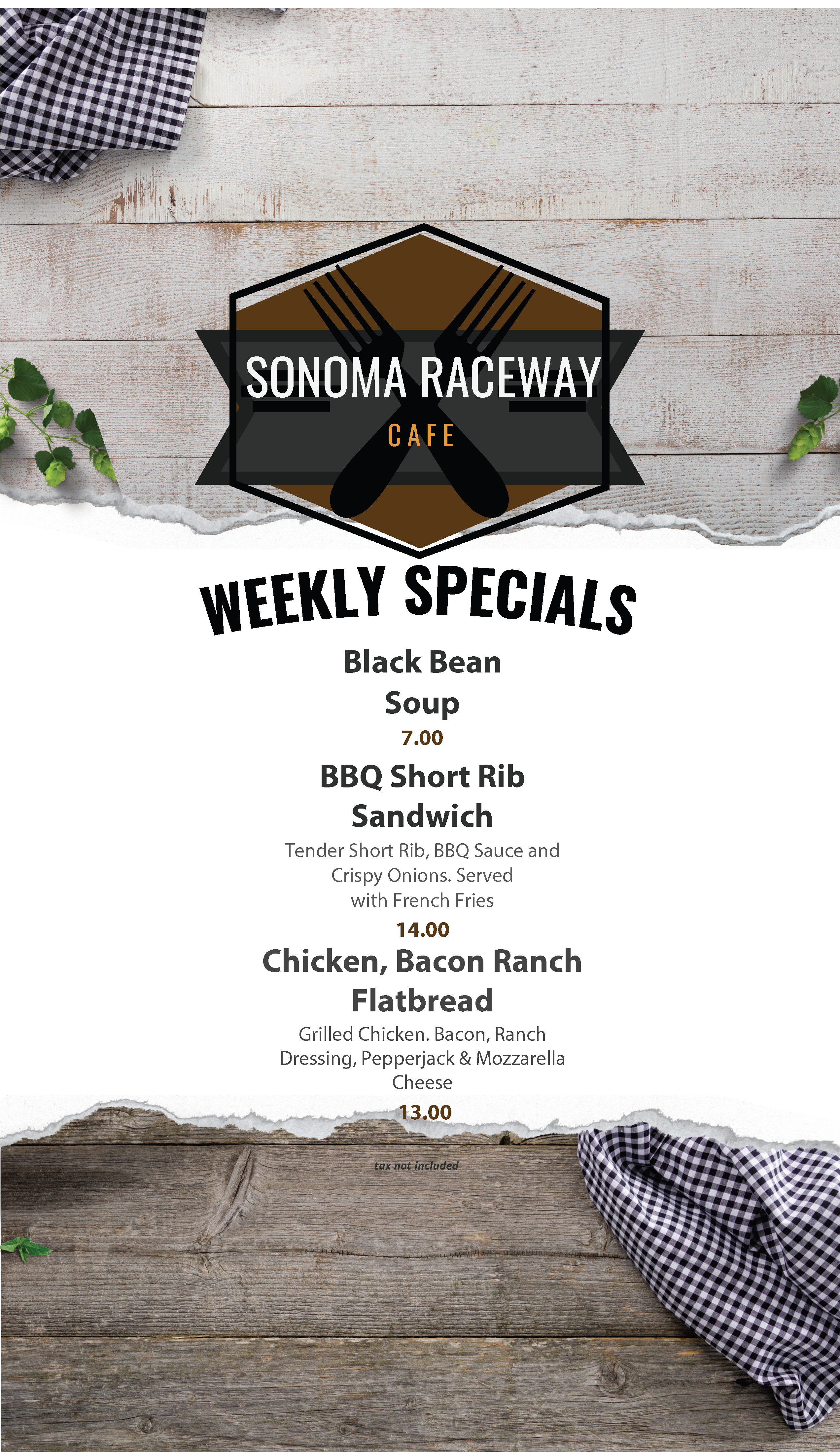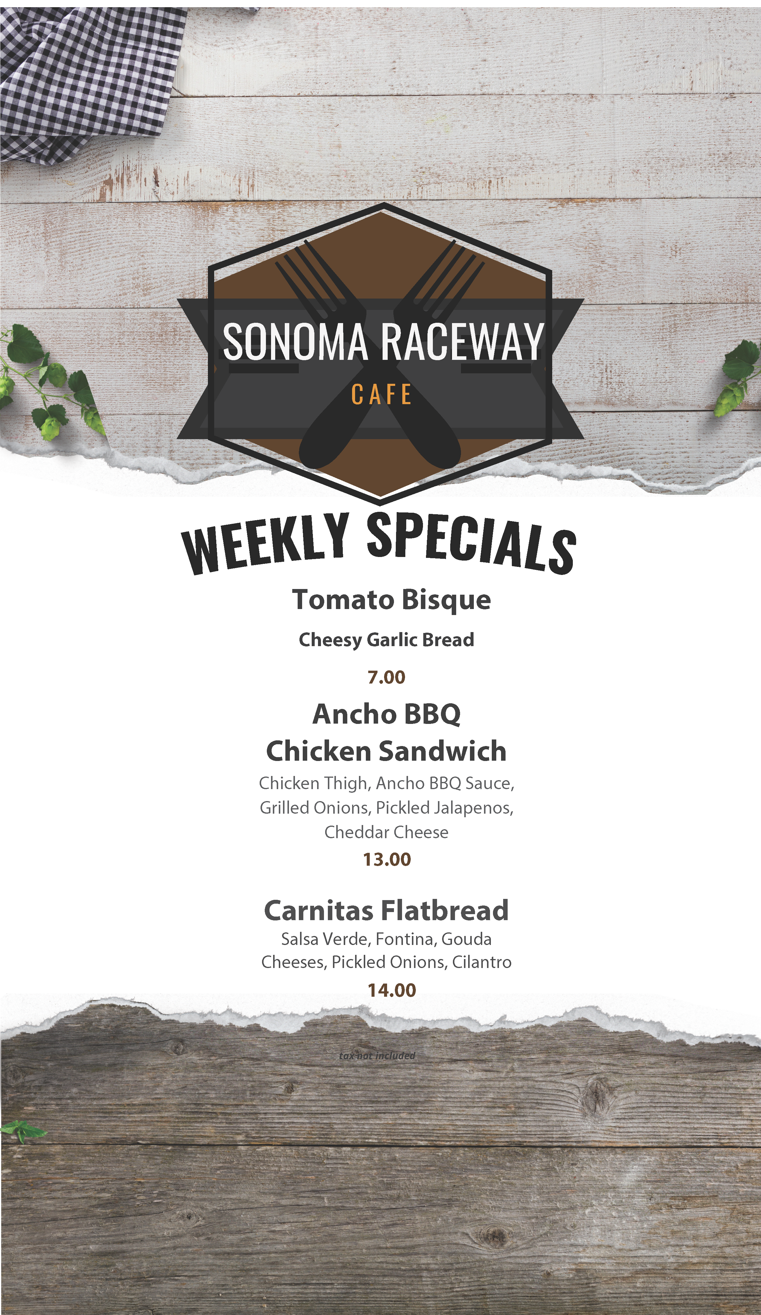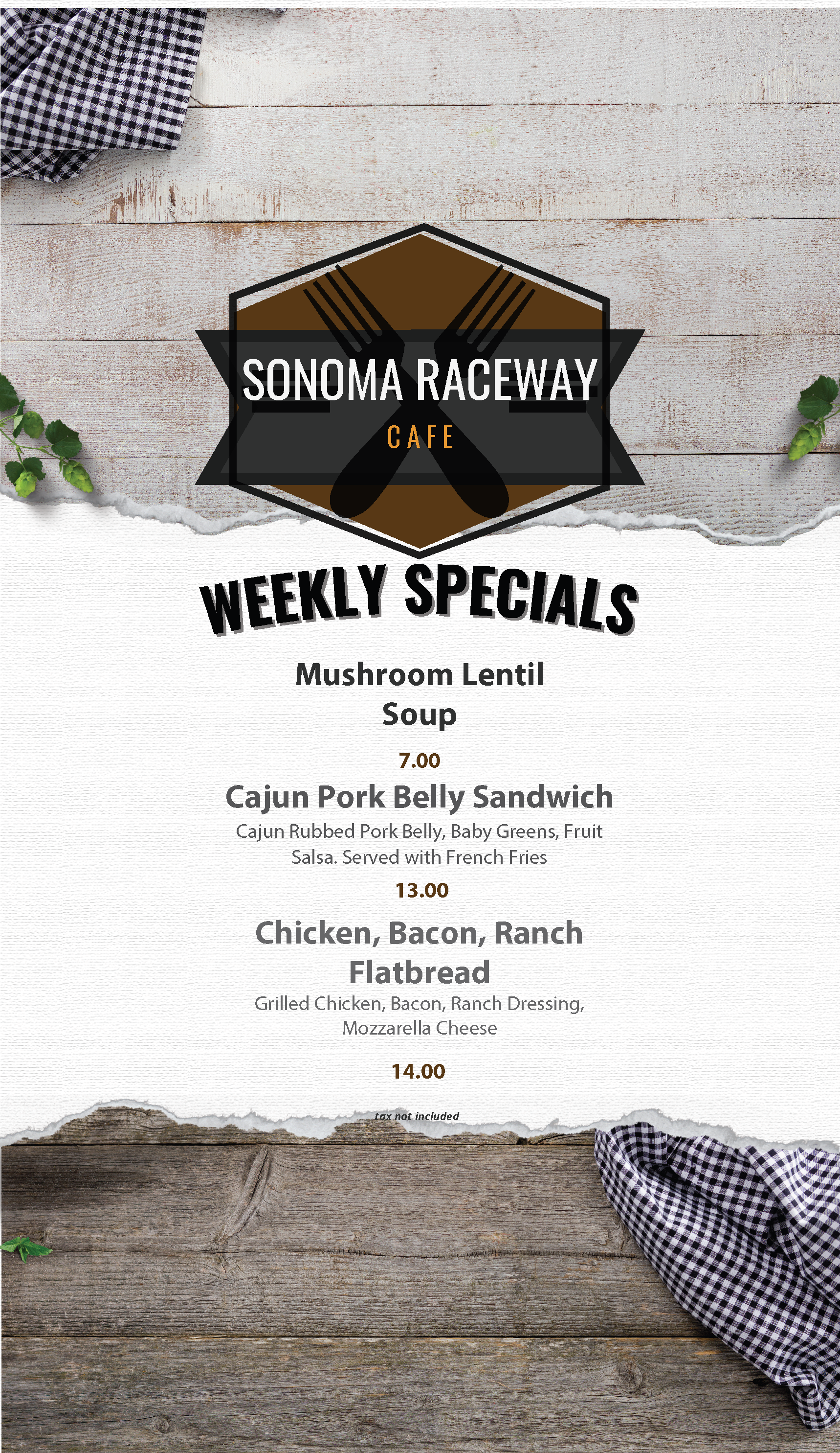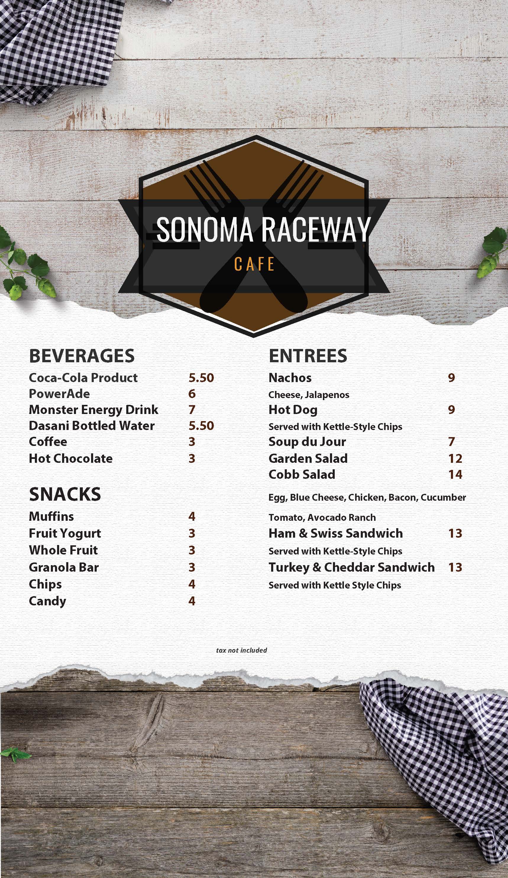 The Raceway Cafe, located in the paddock of Sonoma Raceway, offers a full menu of local cuisine that will surely quench your taste buds! The dining room inside the Cafe features flat screen TV's with Satellite TV alongside a cozy dining space, while directly outside the cafe there is a covered patio with picnic tables to enjoy your meal.
