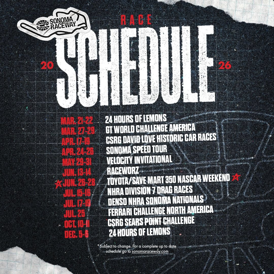 “Our 2026 schedule reflects everything that makes Sonoma Raceway special,” said Sonoma Raceway Executive Vice President and General Manager Brian Flynn. “It’s a season built around variety, passion and world-class competition, and we can’t wait to welcome fans of all ages back to the track.”